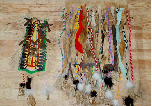 腰裙下擺的前后配戴著50個(gè)銅鈴,以此代表眾多神靈的福音。腰裙上還系著一對(duì)熊神和一對(duì)狼神偶體,因?yàn)槎鯗乜巳苏J(rèn)為熊是人類的祖先,人們不能輕易傷害獵取,如果一旦打死熊,也要對(duì)熊骨進(jìn)行風(fēng)葬。而狼據(jù)說是神靈的兒子。這些又都可見薩滿信仰又與鄂溫克人在原始社會(huì)條件下的自然崇拜、祖先崇拜有著非常緊密的淵源關(guān)系。