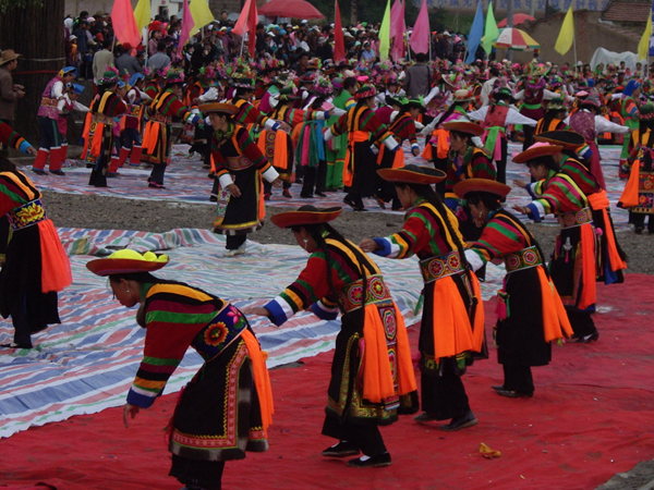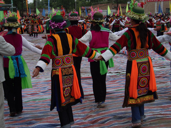 不同地區(qū)的土族舞蹈具有相對獨立性,互助的“安昭”、民和的“納頓”、大通的“踏灰”、同仁的“於菟”、甘肅卓尼的“嘎爾”等是最具代表的民間舞蹈。“安昭”,土語稱之為“千佼日”,意為“彎曲”或“轉圈”,是土族民間喜慶節(jié)日和婚禮儀式中,用于禮贊祈祝的一種圓場群舞,也是一種歌舞結合、無樂器伴奏的集體舞蹈。一般由男女各半圍成圓圈,由一男子帶領,一唱眾和。舞蹈動作簡單質樸,舞者兩手由右胯旁起向左上方至右上方劃圓弧,變?yōu)樽笫智谀X前,右手高居于后,似雄鷹翱翔于藍天?!办遁恕蔽杓椿⑽?。“於菟”,是古代楚人對虎的方言稱謂。每年農歷十一月二十日祭山神時,名為於菟的舞者在赤裸的上身繪制虎豹圖案,模仿虎的形象“前端腿跳”舞蹈,達到祀神驅邪、祈求平安的目的。