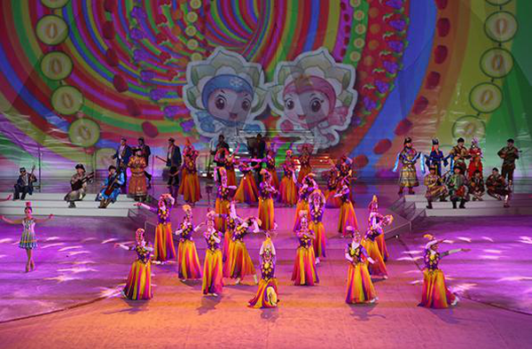 2016年1月20日,為期11天的第十三屆全國冬季運動會在烏魯木齊冰上運動中心速滑館拉開大幕。開幕式由體育儀式、文體表演和點燃主火炬塔三個部分組成。在文體表演章節(jié),承擔(dān)本次開幕式文體表演與伴舞任務(wù)的新疆藝術(shù)學(xué)院200名學(xué)生與來自新疆各民族的文藝工作者一起,為觀眾獻上了一臺精心策劃和編排、以“冰雪天山陽光絲路”為主題的精彩表演。參加開幕式文體表演的舞蹈系2014級、2015級學(xué)生,大部分是第一次參加國家級的大型活動,他們克服嚴寒,用自己的實際行動為精彩冬運會助力添彩
