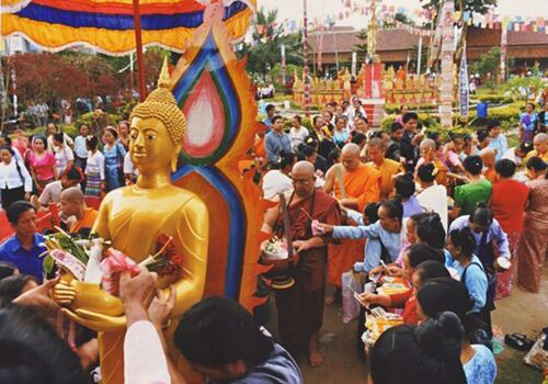 “奧瓦薩”時間在傣歷1 2月1 5日(陽歷9月中旬)。這一天,表示從“關(guān)門節(jié)”以來的安居齋戒期已滿,男女老幼皆盛裝去佛寺里拜佛,以食物、鮮花、蠟條、錢幣獻佛,向佛祖懺悔,祈求佛祖賜福降平安,同時舉行盛大的娛樂集會,“章哈”演唱,放高升、晚上放焰火、放孔明燈等,慶祝開門節(jié)。此時,雨季已過,稻谷收割完畢,故也稱為慶祝豐收的節(jié)日。