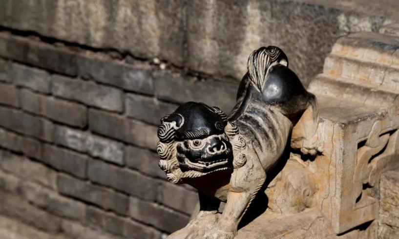 石雕“麒麟送子”也是對家族人丁興旺的企盼。王家大院高家崖凝瑞居后院墻上的墻基石“麒麟送子”圖,祥云瑞氣繚繞著,捧出一條花草的道路,一只不吝雕工的麒麟活潑歡快地向前奔跑,他的身后是慈眉善目的老嫗形象。頭頂上還有一株大樹,上刻兩只小鳥,那就是“殷勤為探看”的青鳥吧,在這個(gè)時(shí)刻青鳥所關(guān)心的是小兒即將開始的人生旅程。