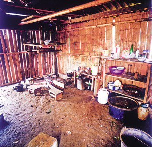 房內(nèi)一般隔成里外兩間,里間狹小,光線暗,是主人的臥室,只放雙人床和一小部分生活用品。外間寬大,是生火煮飯、聚會待客和子女就寢的地方?;鹛猎O在里間屋的門外,放鐵制三腳架,三腳架對應的方位有固定的用途,即靠里間房門一方為主人的座位,靠外間房門一方為客人的座位,火塘上方靠墻處為子女的床位。如有成年子女和新婚夫婦,則在外間再隔出小間,里間和外間存放著生產(chǎn)用具和酒具。房內(nèi)幾乎沒有什么家具和裝飾性的陳設,有的甚至沒有桌椅和床鋪,只在火塘周圍鋪著竹席或木板,合衣向火而眠?;鹛辽厦?米多高處懸掛著竹編的約1米見方的架子,上面放著食具、鹽巴、辣椒等,也是烘烤牛肉干的地方。架子上面靠房頂處并排放著幾個粗大的竹筒,里面存放糧食。這幾年的新村民居,在保持傳統(tǒng)民居特征的前提下使用了新型建材,更堅固,更舒適。