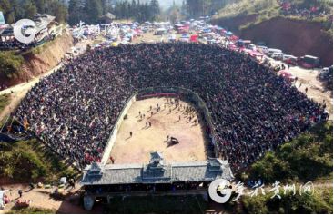 貴州省從江縣第十五屆原生態(tài)侗族大歌節(jié)的前一天,恰逢該縣逢亥斗牛日,丙妹鎮(zhèn)松學(xué)斗牛塘、谷坪鄉(xiāng)四寨河斗牛塘同時(shí)舉辦傳統(tǒng)牛王爭霸賽,喜迎一年一度“侗族大歌節(jié)”的到來,共有來自周邊村寨的80頭水牯牛參戰(zhàn),斗?;顒?dòng)場上名牛角逐,場面異彩紛呈,吸引數(shù)萬名觀眾前來觀戰(zhàn)。