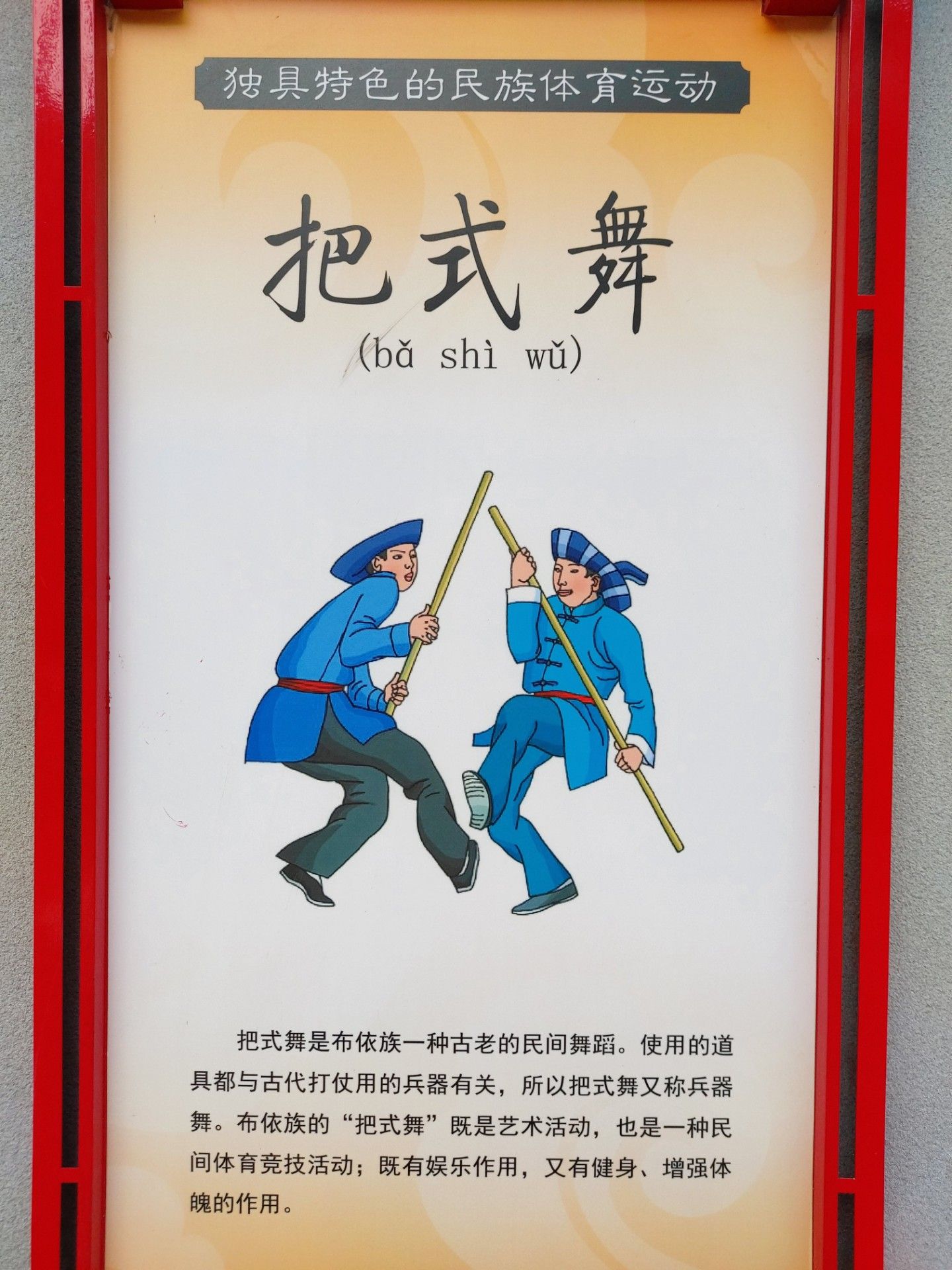 把式舞是布依族一種古老的民間舞蹈。使用的道具都與古代打仗用的兵器有關,所以把式舞又稱兵器舞。布依族的“把式舞”既是藝術活動,也是一種民間體育競技活動;既有娛樂作用,又有健身、增強體魄的作用。
