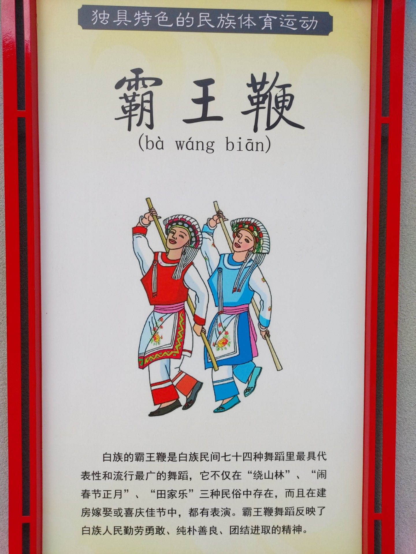 白族的霸王鞭是白族民間七十四種舞蹈里最具代表性和流行最廣的舞蹈,它不僅在“繞山林’”、“鬧春節(jié)正月”、“田家樂(lè)” 三種民俗中存在,而且在建房嫁娶或喜慶佳節(jié)中,都有表演。霸王鞭舞蹈反映了白族人民勤勞勇敢、純樸善良、團(tuán)結(jié)進(jìn)取的精神。