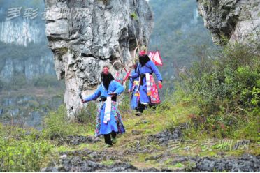 地戲演員利用勞作空閑時(shí)間在山間排練地戲。