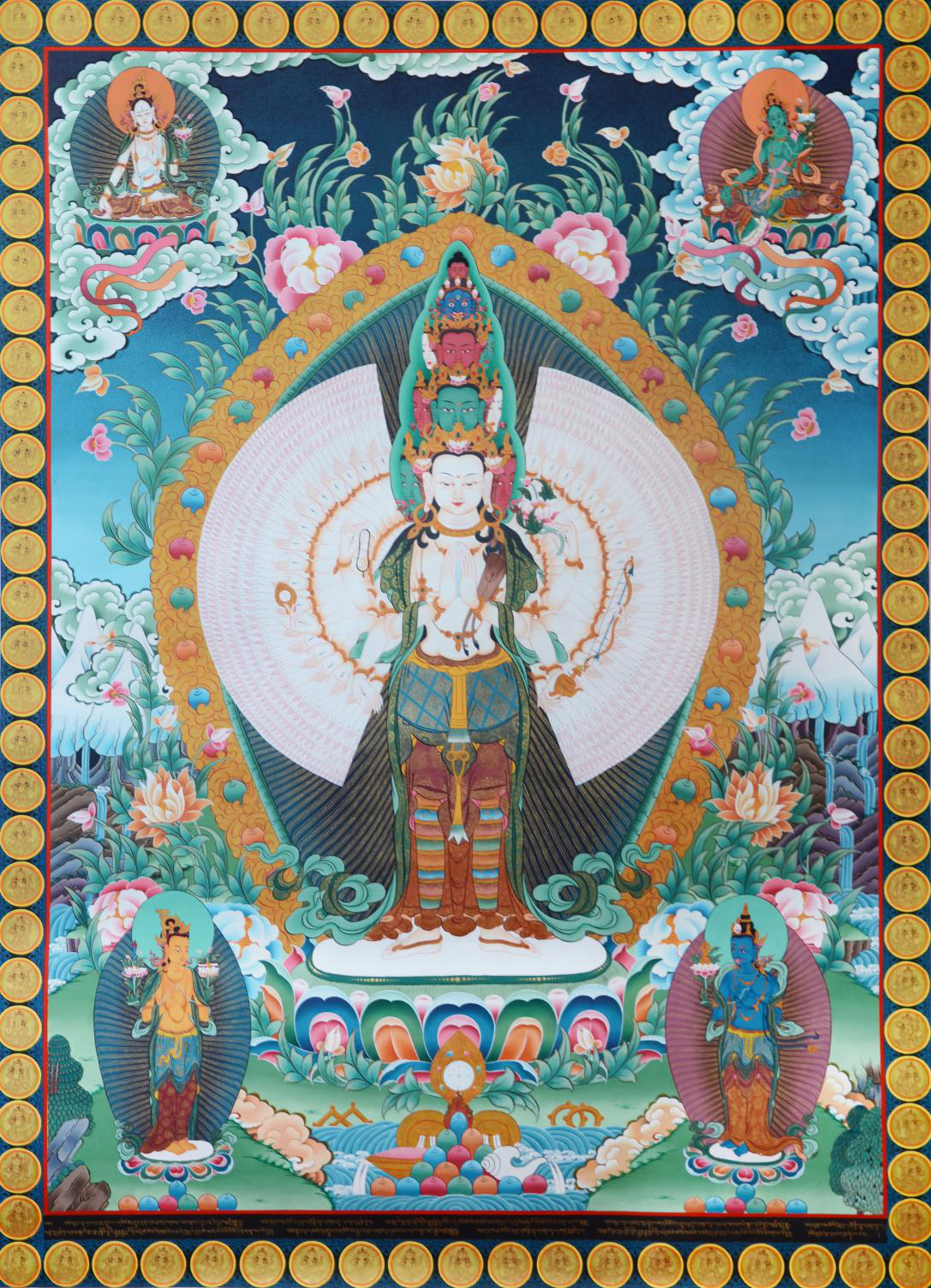"千手觀音"全稱"千手千眼觀世音菩薩",又稱"千眼千臂觀世音菩薩",是佛教六觀音之一。 佛教認為,眾生的苦難和煩惱多種多樣,眾生的需求和愿望不盡相同,因此,就應(yīng)有眾多的無邊法力和智慧去度濟眾生。據(jù)《千手千眼觀世音菩薩廣大圓滿無礙大悲心陀羅尼經(jīng)》說,觀世音菩薩在過去無量劫,聽千光王靜住如來講《廣大圓滿無礙大悲心陀羅尼經(jīng)》時,為利益一切眾生,"即發(fā)誓言,若我當來堪能利益安樂一切眾生者,令我即時身千手千眼具足","發(fā)誓愿已,應(yīng)時身千手千眼悉皆具足",變現(xiàn)出如意寶珠、日精摩尼寶珠、葡萄手、甘露手、白佛手、楊柳枝手等。無論眾生是想渴求財富,還是想消災(zāi)免病,千手觀音都能大發(fā)慈悲,解除諸般苦難,廣施百般利樂。在佛教看來,只要虔誠地信奉千手觀音,就有"息災(zāi)","增益","敬愛","降伏"等四大好處。