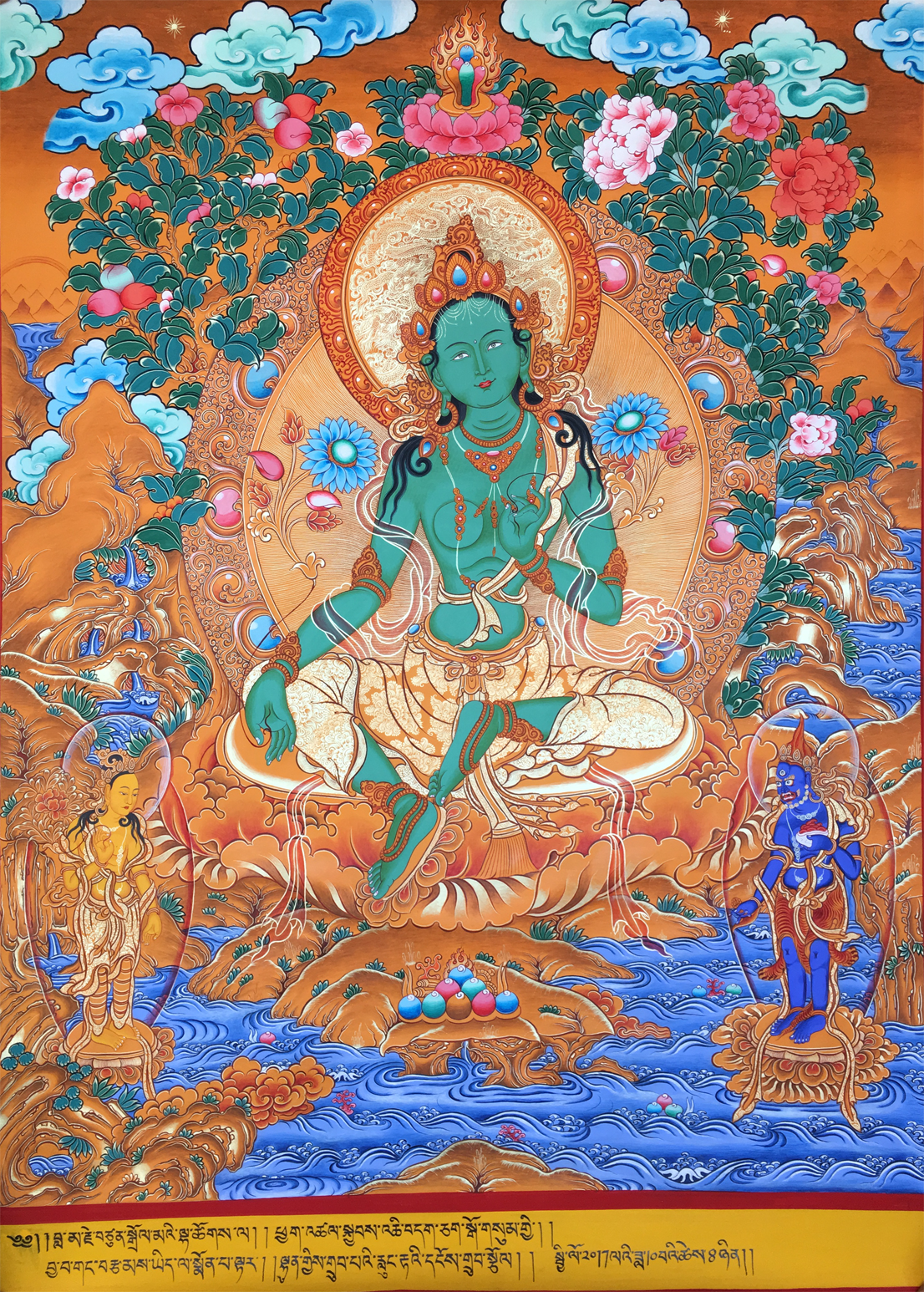 綠度母即觀世音菩薩之化身,為二十一度母之主尊,持通本尊咒,能總持二十一度母之功德。修持此尊密法,能斷生死輪回,消除一切魔障、業(yè)障,并能消災(zāi)增福,延壽廣開智能,凡有所求無不如愿成就,且命終往生極東世界。唐朝的文成公主咸信是綠良母的化身。