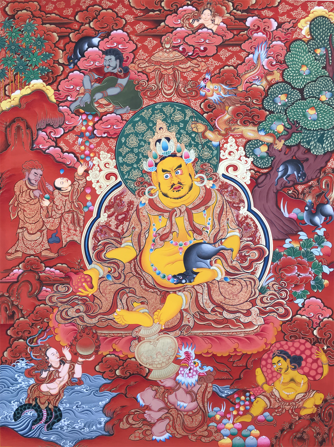 黃財神即黃布綠金剛,藏名為:“藏巴拉 些?!?。財源廣黃財神為五姓財神之一,主司財富,能使一切眾生脫于貧困,財源廣進(jìn)。當(dāng)初釋迦牟尼佛于靈鷲山宣傳說大般若經(jīng)時,諸魔鬼神等皆前來障礙,令高山崩塌,大眾驚恐,此時黃財神就現(xiàn)身庇護(hù),后來世尊囑咐黃財神,當(dāng)于未來世助益一切貧困眾生,為大護(hù)法。