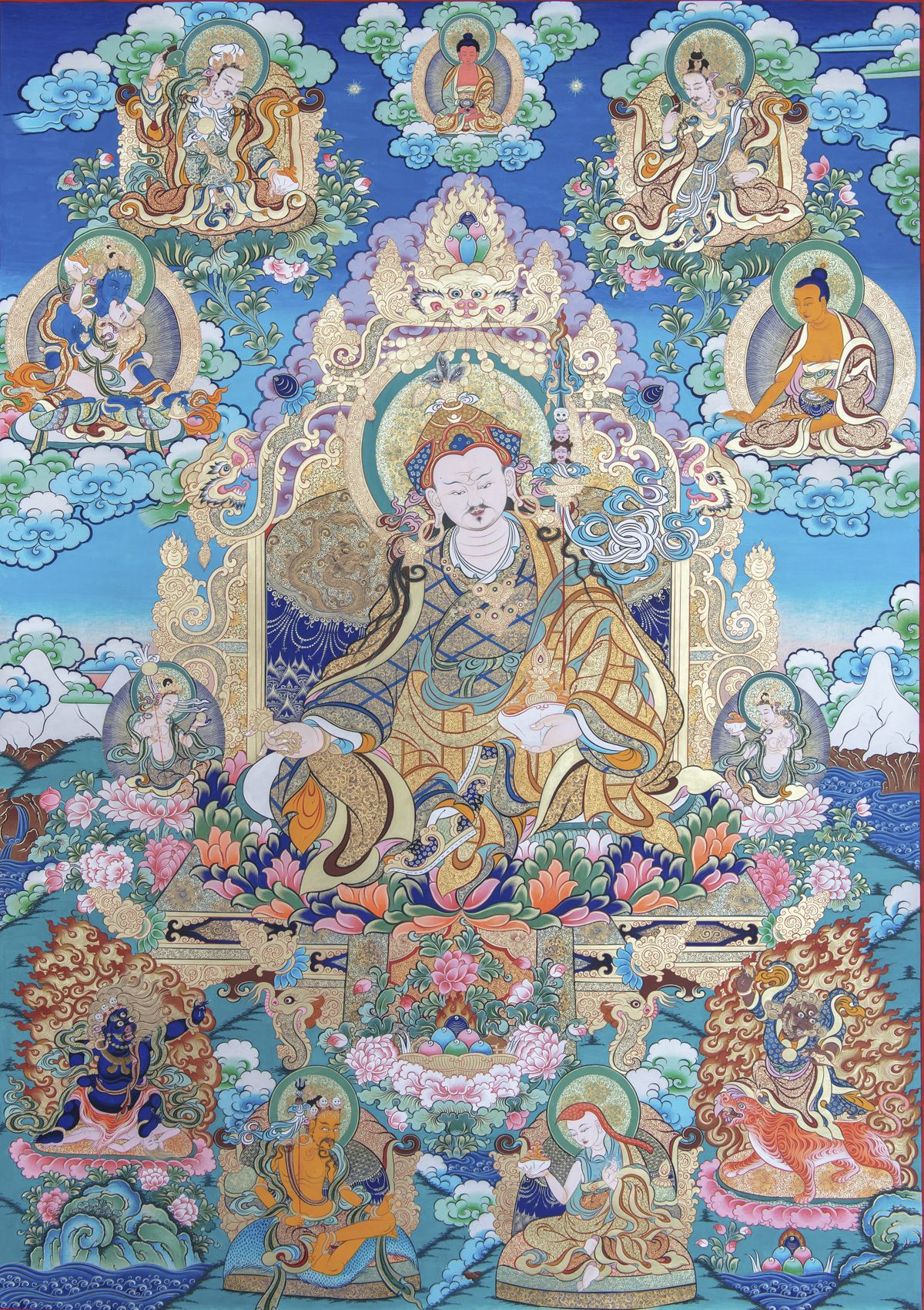 蓮花生大師,印度佛教史上最偉大的大成就者之一。公元八世紀,應藏王赤松德贊迎請入藏弘法,成功創(chuàng)立了西藏第一座佛、法、僧三寶齊全的佛教寺院——桑耶寺。他教導藏族弟子學習譯經,從印度迎請無垢友等大德入藏,將重要顯密經論譯成藏文,創(chuàng)建顯密經院及密宗道場,開創(chuàng)了在家出家的兩種圣者應供軌范,如是等等,奠定了西藏佛教的基礎。藏傳佛教尊稱他為咕汝仁波切(意為大寶上師)、鄔金仁波切(烏仗那寶)。通稱貝瑪迥乃(蓮花生)。據(jù)多羅那他于1610年所著《蓮花生傳》所載,約于摩揭陀國天護王時出生于鄔金國王族。圣誕日:藏歷六月初十。