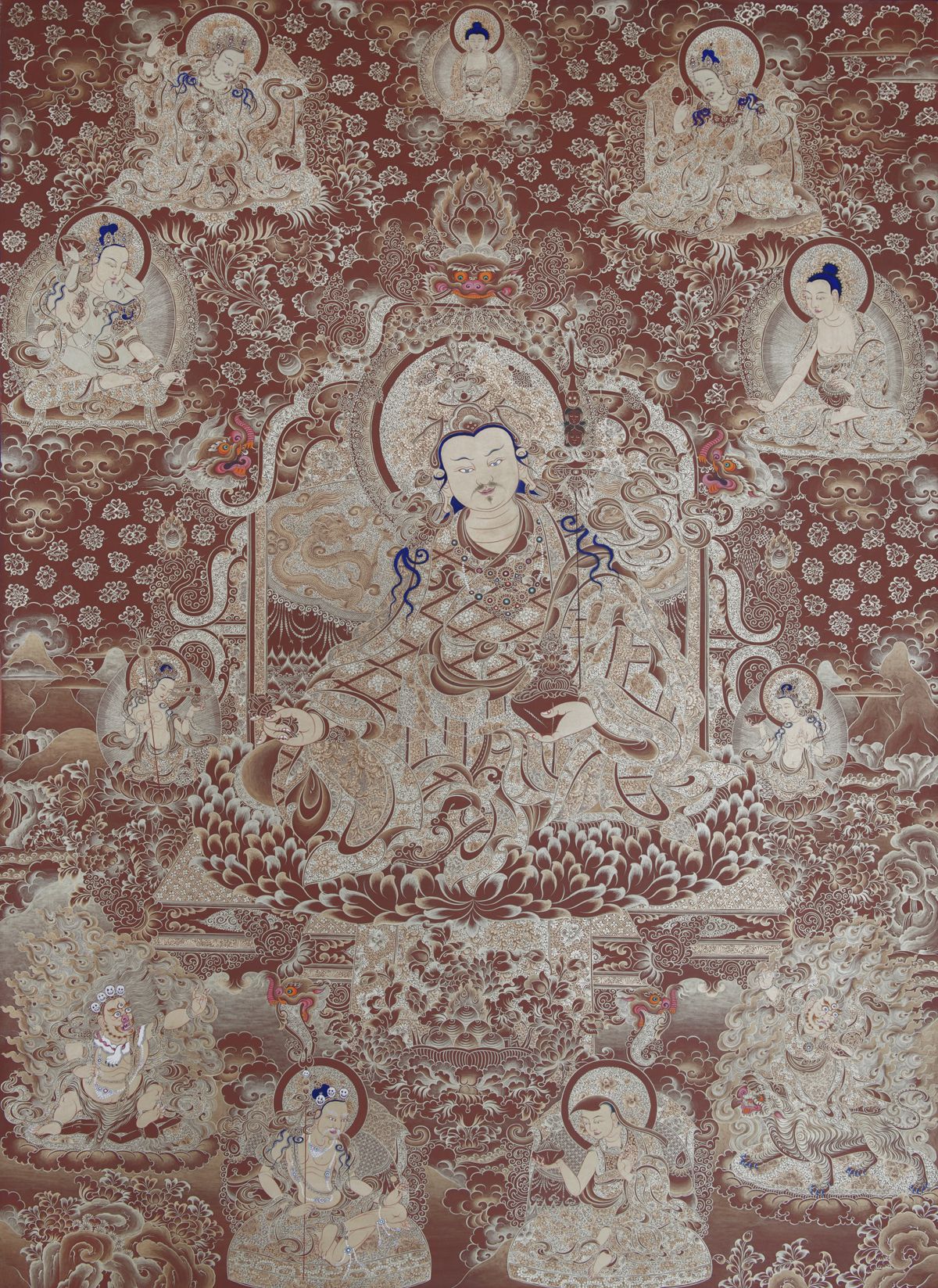 (八)獅吼蓮師(Guru Senge Dradog):在印度金剛座,蓮師于辯論中擊敗了五百邪見外道,并依靠咒術(shù)的威力降伏了他們,使外道們屈服并皈入佛門,此時(shí)叫革日桑給扎周,即獅吼蓮師。