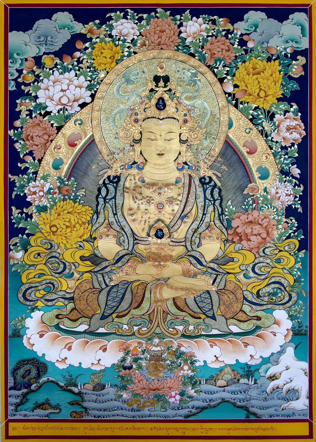 長壽佛(梵名Aparimita āyur jnāna su-vinisˊicita tejo rājāya tathāgata),在漢譯佛經(jīng)中無其形象之記載描述,藏傳佛教中其畫像為一面二臂,肌膚紅色,盤發(fā)成髻戴五佛寶冠,上穿天衣,下著綢裙,身佩珍寶瓔珞,具足一切報(bào)身佛的種種莊嚴(yán),雙手結(jié)禪定印于膝上,托長壽寶瓶,雙足以金剛雙跏趺安住于蓮花月輪上。