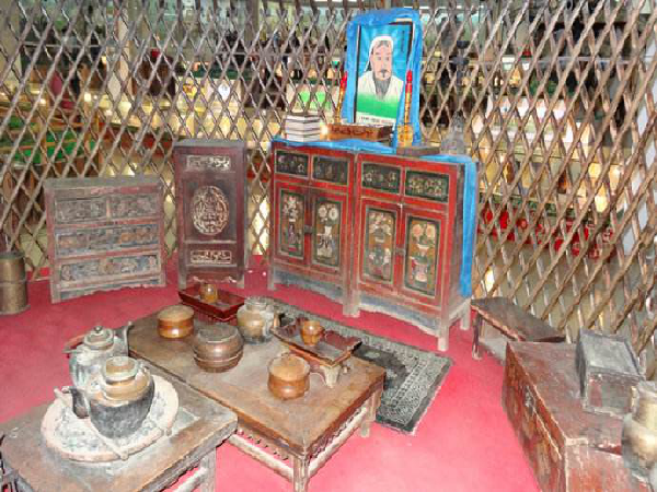 亞洲游牧、游獵民族創(chuàng)造的移動式民居,在其發(fā)展過程中形成了兩大流派:一種是中國鄂倫春人的傳統(tǒng)建筑歇仁柱式(在鄂倫春語里歇仁柱為“木桿屋”之意),即尖頂、用獸皮或樹皮、草葉子做苫蓋。另一種是蒙古包式的,即穹頂圓壁,主要用毛氈做其覆蓋物。蒙古包的包門開向東南,既可避開西伯利亞的強冷空氣,也沿襲著以日出方向為吉祥的古老傳統(tǒng)。而帳內(nèi)的中央部位,安放著高約二尺的火爐。火爐的東側(cè)放著堆放炊具的碗櫥,火爐上方的帳頂開有一個天窗。火爐西邊鋪著地氈,地氈上擺放矮腿的雕花木桌。包門的兩側(cè)懸掛著牧人的馬鞭、弓箭、獵槍以及嚼轡之類的用具。帳內(nèi)的西側(cè)擺放著紅漆彩繪木柜,木柜的北角上敬放著佛龕和佛像,佛像前供放著香爐及祭品。