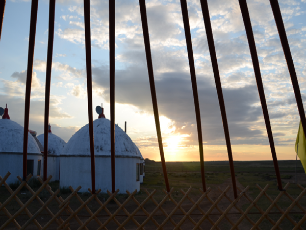 氈門。哈那立起來以后,把網(wǎng)眼大小調(diào)節(jié)好,哈那的高度就是門框的高度。門由框定。因此蒙古包的門不能太高,人得彎著腰進。氈門要吊在外面。