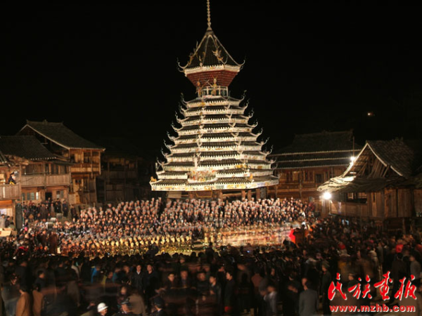 后來,鼓樓功能逐漸擴大,不僅有擊鼓報信,召集族人議事的場所功能,還成為村寨的娛樂休閑中心。鼓樓在侗語叫“百”,意為“扎堆”、“聚集”。農(nóng)閑時節(jié)或耕作之余,人們來到鼓樓下聊天、唱歌、講故事。每逢喜慶節(jié)日,盛裝的侗家人就會在鼓樓坪歡聚一堂,吹蘆笙、踩歌堂,演侗戲,年輕人甚至利用這個場所對歌敘情、談情說愛。正如侗族民歌中所唱“鼓樓是村寨的暖和窩,沒有鼓樓無處尋歡樂,高高的杉木豎起鼓樓來,有了聚集的地方有了歡樂的歌”,這些正是對鼓樓功能擴大的最好佐證。