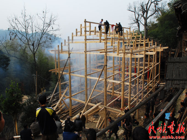 建房是人生中的一件大事,同時也有許多講究和說法。準備建房材料時首先要選取上乘的中柱。在砍伐中柱時需準備香燭、紙錢、酒、魚、糯米飯到樹下祭奠,主人先砍幾斧,再由其他親友砍伐。備好的材料經(jīng)曬干、推刨后由木匠發(fā)墨。發(fā)墨時主人在木柱一端執(zhí)線,木匠在柱上拉直用力一彈,墨線筆直均勻,則表示吉利,否則還要重新發(fā)墨。立房是家中的一件大事。一般立房架和上梁同日進行,屆時族人都會來幫忙,他們齊心協(xié)力把新房立起來,來參加立房架儀式的親戚朋友都會帶禮品來慶賀。立大門時要殺一只公雞祭祀。待蓋房、裝飾等完成之后再擇吉日喬遷。