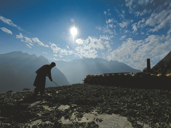 68歲的楊慶平在屋頂上晾曬煙葉,遠處矗立著地震中唯一保存完好的碉樓