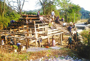 筆者看到的干欄式木樓和吊腳樓在使用的功能上相差無幾,上層住人待客,樓下四壁用木板圍擋,圈養(yǎng)畜禽,存放燒柴、農(nóng)具和秋收臨時堆放的糧食。豬圈靠里側(cè)依柱圍欄,其它空閑的地方打掃得干干凈凈,有的將織布機放在樓下明亮的地方。住房一般5間,兩頭兩間是偏廈,中間3間是寬敞的堂屋,一頭設(shè)火塘、土灶,為烤火、煮飯之處;另一頭的中柱供臨時設(shè)席敬神之用,也有的在板墻上設(shè)佛龕神位,供奉祖先;臥室依房柱用木板靈活隔間。大門有的開在房山墻一側(cè),也有開在中間的,皆登石階、板梯而上。吊腳樓一棟挨著一棟,小巷道曲折狹窄,只容牽牛和順向挑擔(dān)通過。