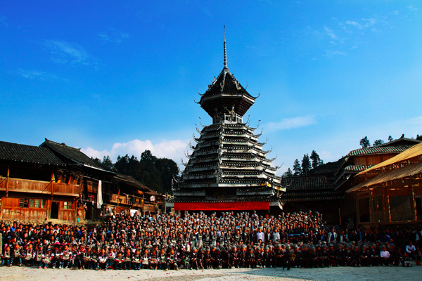 每年的農(nóng)歷八月十五中秋節(jié),小黃都會(huì)舉行賽歌會(huì),有幾十上百人唱歌的壯觀場(chǎng)面,是觀賞侗歌的最佳時(shí)機(jī)。侗族的大歌表演常在鼓樓舉行。侗族的鼓樓、風(fēng)雨橋和大歌是侗族原生文化最突出的標(biāo)志,被稱作“侗寨三寶”。鼓樓是侗族村寨的標(biāo)志性建筑,形似巨大的杉樹,村民稱之為“遮蔭樹”。在沒有鼓樓的年代,人們的許多活動(dòng)是在古杉樹下進(jìn)行的。后來,為了滿足社會(huì)和文化活動(dòng)的需要,修建固定建筑物時(shí)便以杉樹為原型。文獻(xiàn)資料稱:“侗人居溪峒中,春以巨木埋地作樓,高數(shù)丈,歌者夜則緣宿其上。”這就是最初的“鼓樓”。