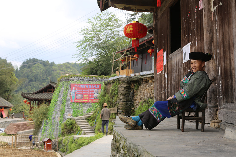 石拔三大媽的家位于村口,老人正在院子里曬太陽(yáng)。這里的苗族習(xí)俗保持得很好,村民日常生活中大多是苗族傳統(tǒng)打扮。大媽頭裹黑帕頭、穿一件綠色繡花苗裝,利落得很。見來了客人,她趕緊把我往屋里讓。