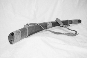 這只紅松木質(zhì)地的鹿哨呈牛角形,中間鏤空,以細(xì)鱗魚(yú)皮熬膠粘合,頭部細(xì),尾部粗,呈喇叭狀;在頭、尾、中間箍三道箍,在接近頭尾的兩端纏細(xì)皮繩為環(huán),環(huán)上系寬皮帶,便于出獵時(shí)背挎于肩或平時(shí)懸掛。它在現(xiàn)存同類(lèi)器物中制作時(shí)間較早,源流、傳承清晰。在它質(zhì)樸的外表下,集中體現(xiàn)了北方狩獵民族的生活經(jīng)驗(yàn)、創(chuàng)造智慧以及審美觀念。