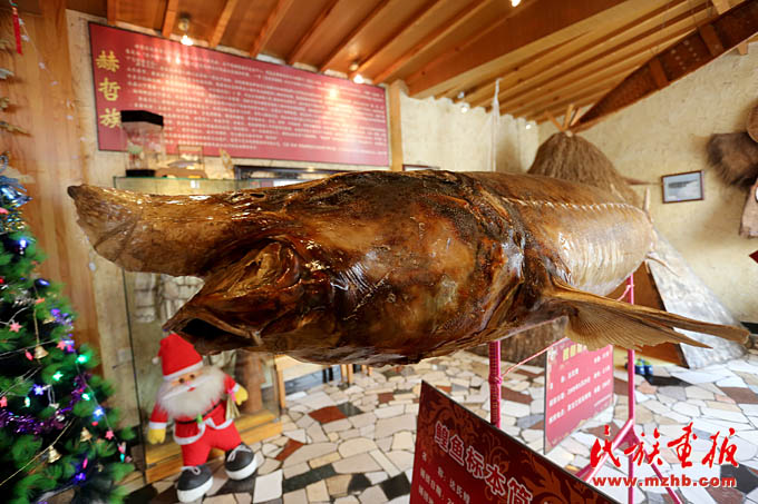 赫哲人把餐廳開到了京城,成為向外界展示赫哲族文化的窗口。圖為赫哲族餐廳內57歲的大鰉魚標本,體長2.5米,重達286斤(陳濤 攝影)