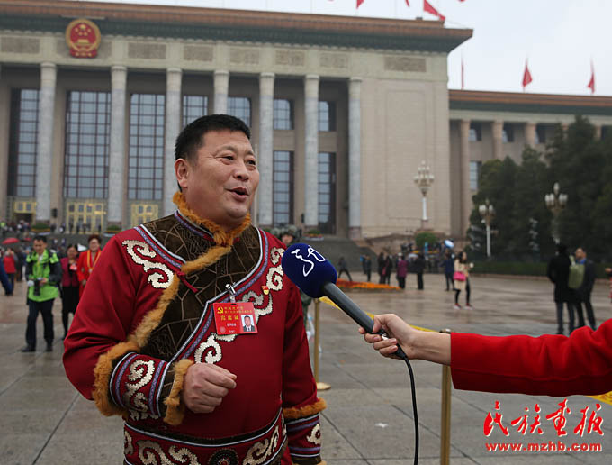 十九大代表尤明國(赫哲族)在會議期間接受記者采訪(滕俊 攝影)