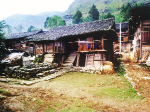 筆者看到的干欄式木樓和吊腳樓在使用的功能上相差無幾,上層住人待客,樓下四壁用木板圍擋,圈養(yǎng)畜禽,存放燒柴、農(nóng)具和秋收臨時堆放的糧食。豬圈靠里側(cè)依柱圍欄,其它空閑的地方打掃得干干凈凈,有的將織布機放在樓下明亮的地方。住房一般5間,兩頭兩間是偏廈,中間3間是寬敞的堂屋,一頭設火塘、土灶,為烤火、煮飯之處;另一頭的中柱供臨時設席敬神之用,也有的在板墻上設佛龕神位,供奉祖先;臥室依房柱用木板靈活隔間。大門有的開在房山墻一側(cè),也有開在中間的,皆登石階、板梯而上。吊腳樓一棟挨著一棟,小巷道曲折狹窄,只容牽牛和順向挑擔通過。