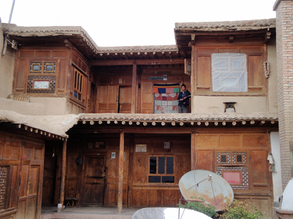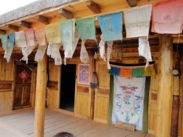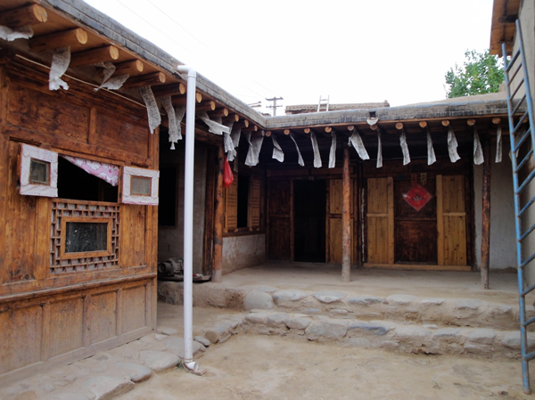 為改善狹小的寨內(nèi)空間,當(dāng)?shù)鼐用窬藿硕幽窘Y(jié)構(gòu)樓房,和青海鄉(xiāng)村民居庭院寬敞的特點(diǎn)形成了反差。寨內(nèi)民居庭院多為四合院式,房屋為土木結(jié)構(gòu)平頂房,一般民居都有飛椽花藻之類(lèi)。屋內(nèi)一般以木板作隔扇,室內(nèi)有護(hù)炕木板、護(hù)墻木板墻圍,且多雕花草于其上。房屋一般面闊三間,正面以木板隔墻并裝上木板條方格小花窗。佛堂設(shè)在二樓,佛堂所在的房屋一般都是上房,和佛堂不同向的兩邊廂房一般做臥室。院落中央一般都有豎掛經(jīng)幡的旗桿,還設(shè)有桑臺(tái),具有明顯的藏式特點(diǎn)。