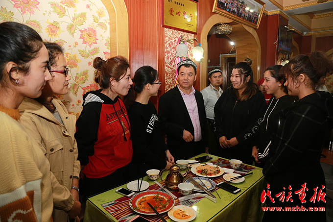 新疆美食城店主阿地力·買買提帶領(lǐng)維吾爾、哈薩克、回族等員工學習十九大報告