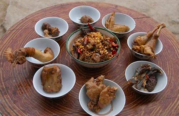 “雞八塊”是指雞身上的八個(gè)主要部位,即:頭、腳(又稱(chēng)大腿)、小腿(大腿的上節(jié)、布依族稱(chēng)為“卦”)、爪、翅、尾、腸、肝。