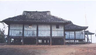 比較典型而普遍的是以德宏地區(qū)一戶一院式的正方形冠蓋式竹樓。構架為穿斗式木梁柱,樓面、隔間均用竹片或木板鋪設。這種竹樓分主樓和附房兩部分。上下兩層,有主副兩座樓梯。主樓呈正方形,樓上住人,分為臥室和客廳,供全家人起居、會客和存放糧食、雜物之用;樓下圈養(yǎng)牲畜。附房多建在主樓的一側,用作堆放柴草及安置舂米的腳碓。