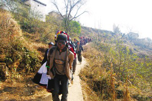 彝族新娘出嫁時,雙腳是不能落地的,不然會被認為不吉利。因此,彝族也就有了“背新娘”的習(xí)俗。