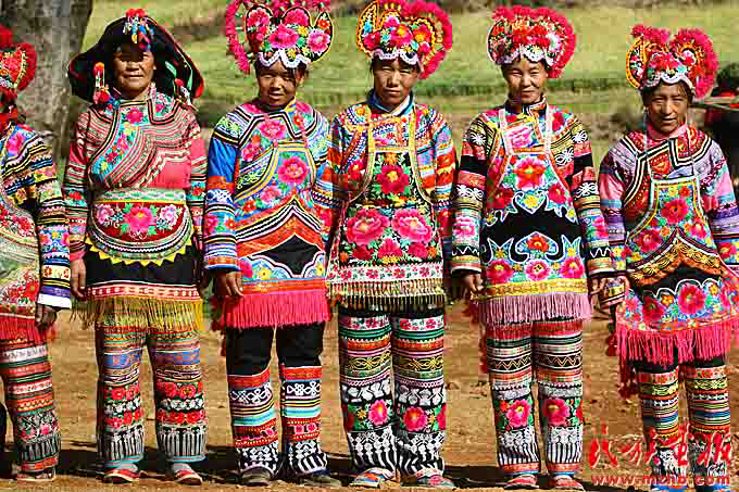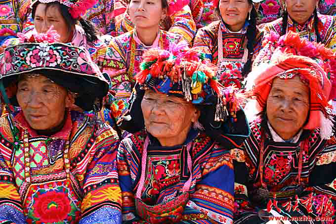彝族女子不分老少,服裝上都繡滿花卉,鮮艷奪目