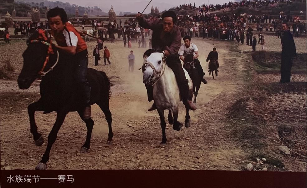 “端午”是都柳江兩岸水族的盛大節(jié)日,賽馬是節(jié)日中的喜慶活動(dòng),輪流在各村寨舉行。比賽開始前,騎手們首先表演騰空躍馬的騎技。然后由一位族中德高望重的老人騎著馬繞“端坡”(賽馬坡)一圈,發(fā)令開始。先到達(dá)終點(diǎn)的人,可獲得精神和物質(zhì)的獎(jiǎng)勵(lì)。水族賽馬是男女老少皆能參與的運(yùn)動(dòng)。