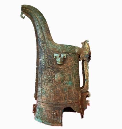 出土時,銅觥側(cè)置平放,銅壺倒置于銅觥內(nèi)。銅觥重13.45千克,器身呈扁圓形。考古專家稱,該銅觥器形獨特,如突出眼睛的變形獸面紋、“C”形扉棱、羊角騰空設計的平嘴犧首等,與以尊、罍為代表的殷墟時期南方特征青銅器相一致。