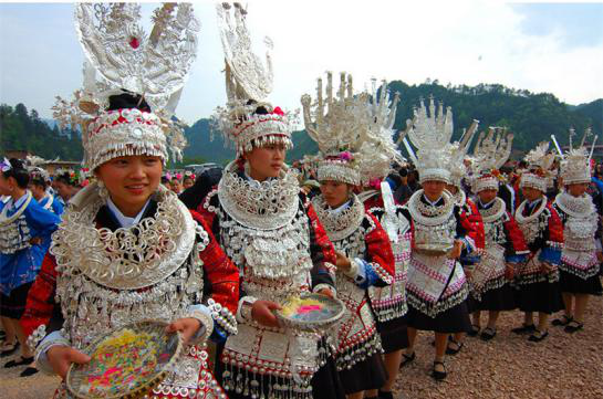 銀飾作為苗族最喜愛的傳統(tǒng)飾物,主要用于婦女的裝飾,品種多樣,分為頭飾、面飾、頸飾、肩飾、胸飾、腰飾、臂飾、腳飾、手飾等,彼此配合,體現(xiàn)出完美的整體裝飾效果。苗族銀飾常出現(xiàn)于苗族的喜慶場合,蘊涵有避邪趨正、納福迎祥的寓意,具體生動地反映著苗族人民的生存狀況、精神面貌和審美心理,具有很高的歷史文化研究價值。在對外交往中,苗族人民把銀飾作為禮品贈送友人,和藏族的哈達、漢族的珠寶一樣珍貴。