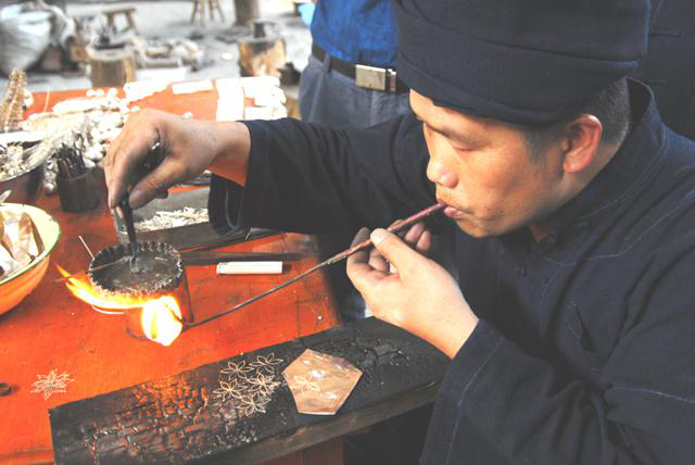 拉絲:若需制作銀絲,便用一個特制的絲眼板拉絲。板上有粗、細、方、圓不同的眼孔,可以拉出4毫米直徑的粗絲,也可以拉出電光絲般的細絲。