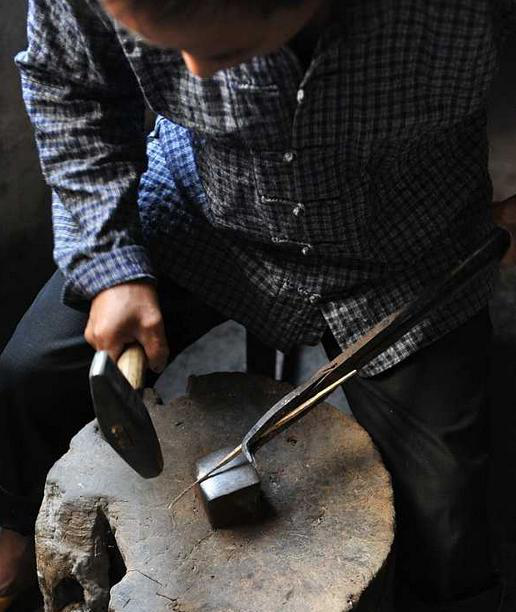 錘打:將熱銀錘打成四方形長條或圓柱狀細條,再根據(jù)制作需要,做成片形或條形。