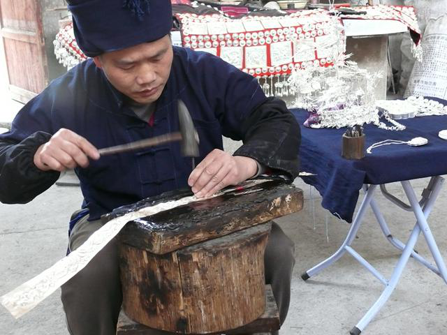 銀飾鍛制是苗族民間獨有的技藝,所有飾件都通過手工制作而成。銀飾的式樣和構(gòu)造經(jīng)過了匠師的精心設(shè)計,由繪圖到雕刻、制作有30道工序,包含鑄煉、捶打、編結(jié)、焊接、洗滌等環(huán)節(jié),工藝水平極高。