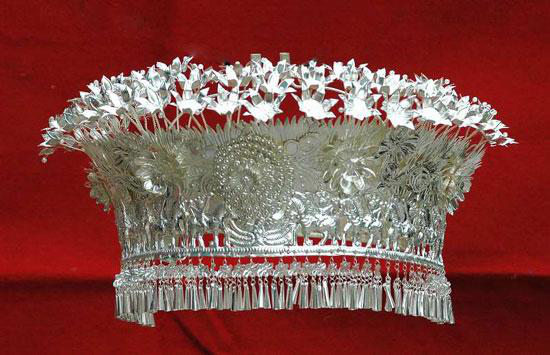 銀鳳冠和銀花帽是頭飾中的主要飾品,也是整套銀飾系列之首,素有龍頭鳳尾之美稱,其制作較為復雜,使用的小件飾品少則一百五十余件,多則達兩百余件,價值昂貴。苗族銀飾,如同苗族刺繡、織錦、蠟染等裝飾物一樣,是苗族支系相互區(qū)別的重要表征,不同地域的銀飾有著不同的特征。