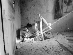 紡線車高約80厘米,寬約60厘米,長約22厘米。紡線車也和切克曼一樣古老,完全靠手工搖,沒有絲毫機械動力。老人紡線時,右手搖動紡線機,左手慢慢放絨,把比普通棉紗線粗兩三倍的絨線纏繞在錠上。這個工序叫做加捻和卷繞。隨著紗條抽長拉細(xì),纖維變得更加平直,紗條強力下降,容易斷裂或延伸,因此需要加上適當(dāng)捻度使其具有一定的強力。這個過程結(jié)束后,老人起身說:“經(jīng)過加捻和卷繞之后,要用水沖洗,晾干后就可使用了?!?/p>