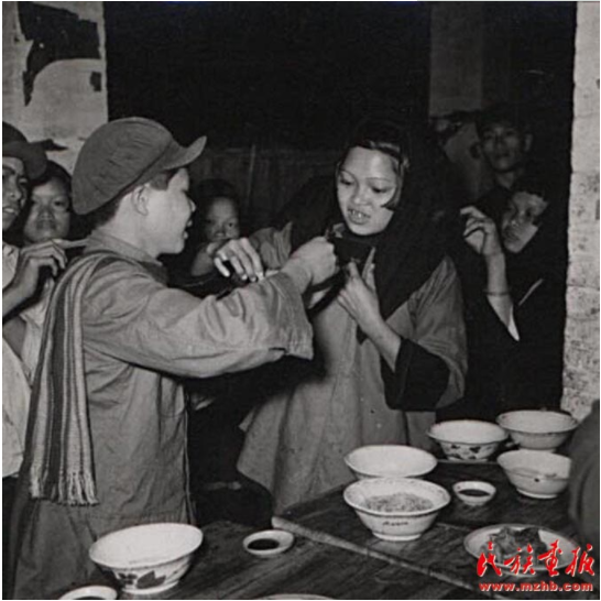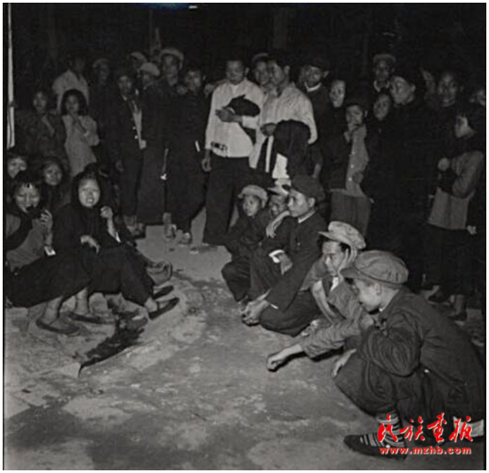 “歌圩”是桂西壯族古老的風(fēng)俗。每年農(nóng)歷正月、二月、四月都有歌圩日。圖為1957年廣西壯族自治區(qū)憑祥市郊區(qū)的歌圩日,這里不但處處歡歌笑語,還有搶花炮、演壯戲、舞彩龍、舞彩鳳、唱桂劇等很豐富的文娛活動(dòng)
