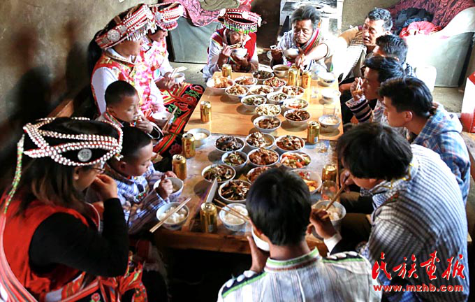 “過去我們一家吃除夕團(tuán)圓飯,有點(diǎn)肉就不錯(cuò)了,哪會(huì)有如此豐盛的宴席。你看如今這滿桌子十幾道菜,吃不完、喝不完,全靠黨和國(guó)家的政策好啊。”在談到春節(jié)的變化時(shí),云南省維西傈僳族自治縣保和鎮(zhèn)臘八底村的蜂大興深有體會(huì)。