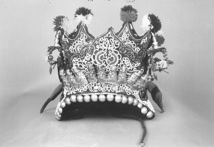 繡花帽由里外兩部分組成,素有“制做繡花帽,先做好襯套”之說。即先按兒童頭徑大小制襯套,做法較簡單,用染過的家織布做里襯,鋪上薄棉,外層為紅綢面,用線依次納緊,以防棉花下滑,縫成筒狀后,頂部用同樣的材料剪成四方形,與上部帽沿結構相同即成。后部分較前部分復雜,先將染過的兩層家織布粘牢,表面貼上各色緞面,顏色自定。把圖樣拓在緞面上,剪下形狀不同的6片材料,把喜愛的圖案描繪在上面,接著用紡車紡出6根各4米長的棉線,用吊砣逐根旋轉纏繞白色呢絨線,經(jīng)濃縮,每根僅得到1米左右線料,將這制好的精線按圖案盤弄,后以花針固定,再輔以其他色線刺繡成圖案點綴其間。把繡好的6片材料組合到襯套上,各片邊沿用黑白兩色線交替鎖邊,帽口用黑金絨布滾邊。此時,帽頂?shù)模吨患饨怯貌噬€制做成圓球裝飾,外面四角下面懸吊白色珍珠串,末端垂著布制五角星。帽的周邊釘上銀制品,最后鑲上反光小圓點飾物似天上星星般光亮,給本就精致美觀的繡花帽增添了一道靚麗色彩,繡花帽就這樣在侗家女的手中誕生了。