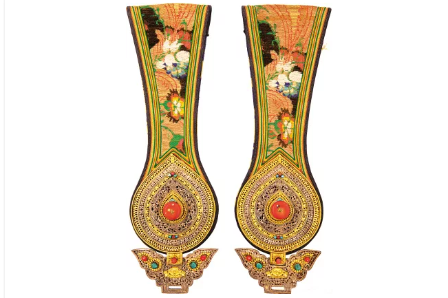 邦典,漢語(yǔ)稱作圍裙或圍腰,是藏族婦女不可或缺的飾品之一。從字面上理解,“邦”在藏語(yǔ)里是“懷”的意思,“典”是“墊”的意思,“邦典”就是保護(hù)藏袍腰部以下部位的墊子。邦典由色條氆氌制成,這是一種藏族聚居區(qū)特有的羊毛織物,工藝精密細(xì)致,配色熱烈明快且過(guò)渡巧妙。系上邦典,再佩上各色銀飾、珠寶,宛若彩虹加身,氣派非凡。