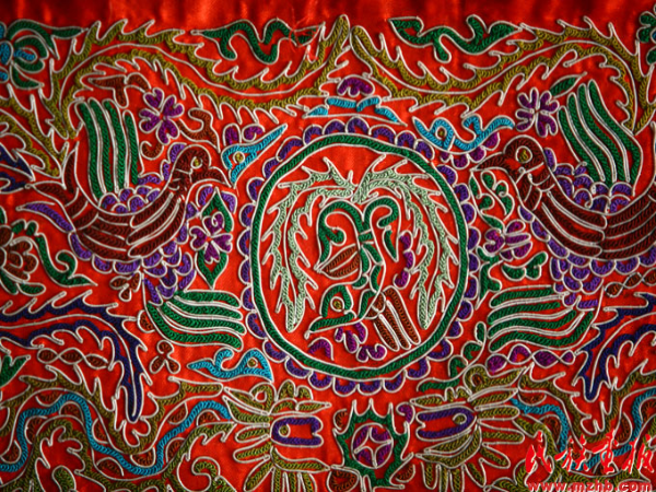 黎錦、壯錦、艾德萊斯綢、氆氌、苗繡、羌繡、馬尾繡、蠟染、扎染……當我們面對這些精美的作品時,我們很難想象到這些東西是由少數(shù)民族婦女的雙手,使用最簡單的紡車、織機等工具創(chuàng)造出來的,她們靠口傳心授把技法熟記于心,大自然是她們模仿的對象,她們制作出的服飾不僅色彩豐富,而且還將民族發(fā)展的歷程紀錄在了服飾上。很多少數(shù)民族沒有自己的文字,對自己民族歷史的記載除了口口相傳以外,他們把一些提煉升華后的符號或織或繡或染到服飾之中。苗族的服飾文化在這一點上極其突出。苗族沒有文字,苗族的歷史文化是靠口頭文學和服飾圖畫藝術(shù)來表達的。苗族老人對苗族少年講述民族歷史時,常指著服飾上的各色圖案一一道來。苗族服飾再現(xiàn)歷史的功能,成為苗族傳世的“無字史書”。