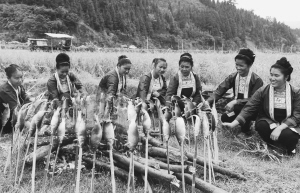 廣西三江侗族自治縣舉辦高山稻魚文化節(jié),當(dāng)?shù)氐某檀?、良口、富祿等鄉(xiāng)鎮(zhèn)以稻田抓魚、烤魚、風(fēng)情表演等活動,吸引游客前往體驗原汁原味的侗鄉(xiāng)稻魚文化,樂享金秋豐收喜悅。近年來,該縣傾力推進(jìn)“種稻養(yǎng)魚”特色產(chǎn)業(yè),將傳統(tǒng)優(yōu)勢轉(zhuǎn)化為資源優(yōu)勢,并大力發(fā)展生態(tài)鄉(xiāng)村游,推銷高山生態(tài)健康食材,使群眾脫貧增收。圖為當(dāng)?shù)厣贁?shù)民族婦女在該縣富祿苗族鄉(xiāng)富祿村稻田內(nèi)烤魚。