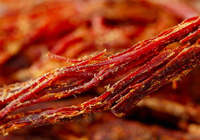 火燒干巴的吃法不復(fù)雜,不加任何輔料,不加任何味道,撕開(kāi)肉絲即可食用。如果覺(jué)得干,可以涼拌一盤(pán)黃瓜輔之,風(fēng)味更甚。剛燒出來(lái)的干巴,香且脆,味勻,擱置太久,會(huì)回軟,失去其原有的香脆可口的口感。
