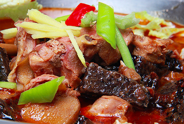 3、大約燉至90分鐘左右后,肉熟骨爛把已炸好的血粑及新鮮紅辣椒一起倒入鴨肉內,再用高火燉5至10分鐘,即可食用。